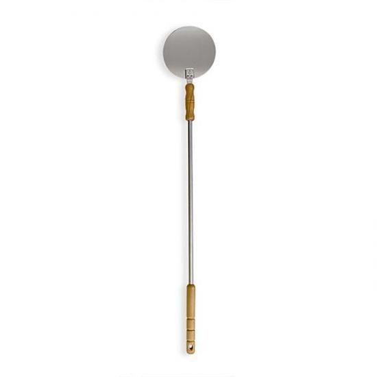 ステンレス製の柄には引っ掛ける穴付きの木製の取っ手が付いています。